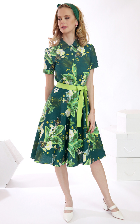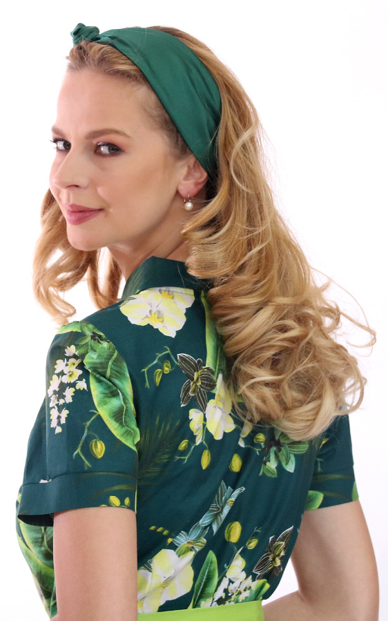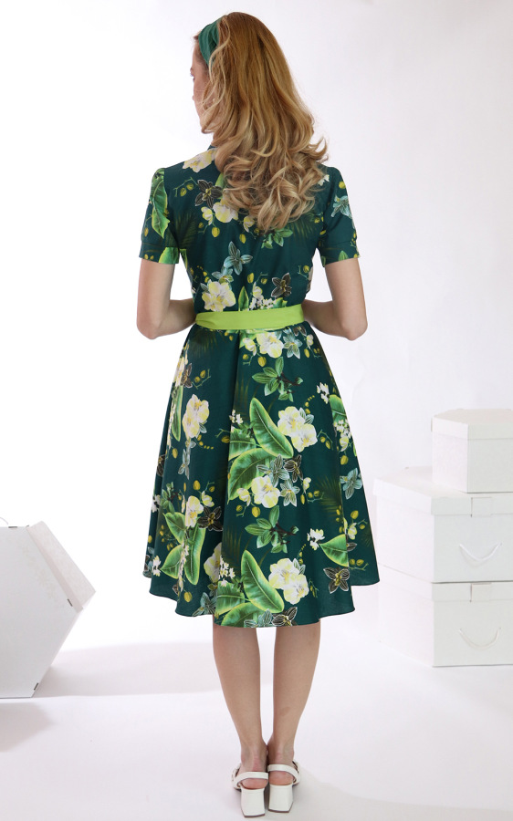 Amber - košeľové šaty s orchideami na zelenom podklade