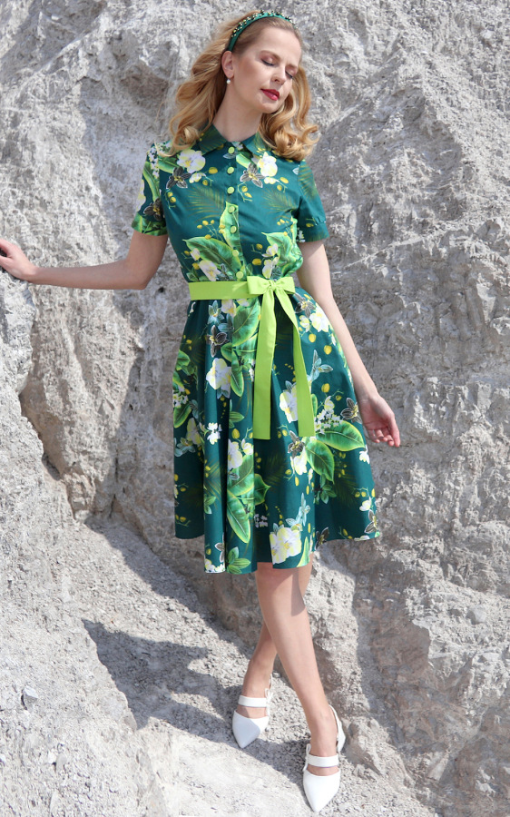 Košeľové šaty z bavlny so širokou A-čkovou sukňou. Majú límček a krátke rukávy. Šaty sú bez podšívky. Zapínajú sa na gombíky vpredu a na zips na ľavom boku. Môžete ich nosiť s opaskom, ktorý je priložený. Všetky použité materiály boli pred zhotovením predprané.