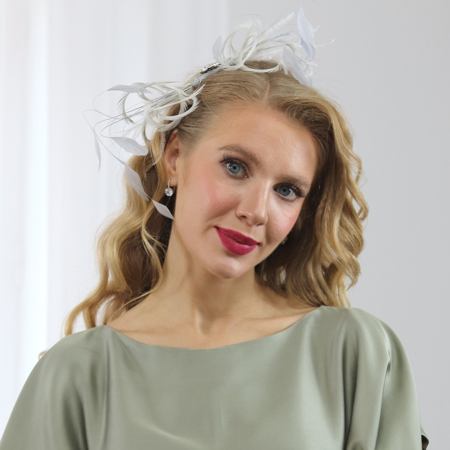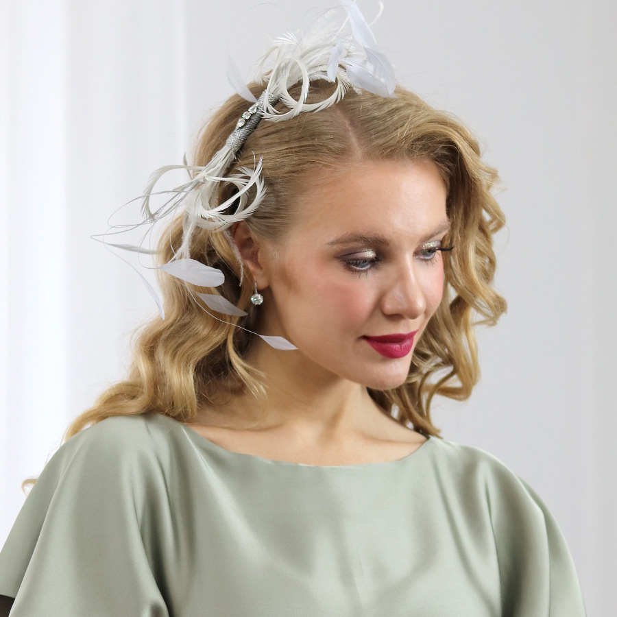 Luxusný fascinátor z kohútieho, husieho a pštrosieho peria, ozdobený kryštálmi na páske z prírodnej slamy sinamay. Upevnený je na kovovom hrebeni.
