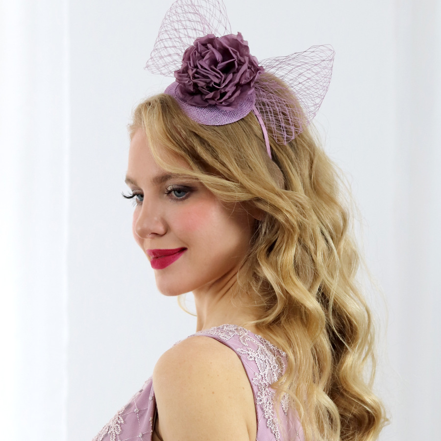 Fascinátor s hodvábnou ružou, mašľou z francúzskeho závoja a základu z prírodnej slamy sinamay. Upevnený je na čelenke.