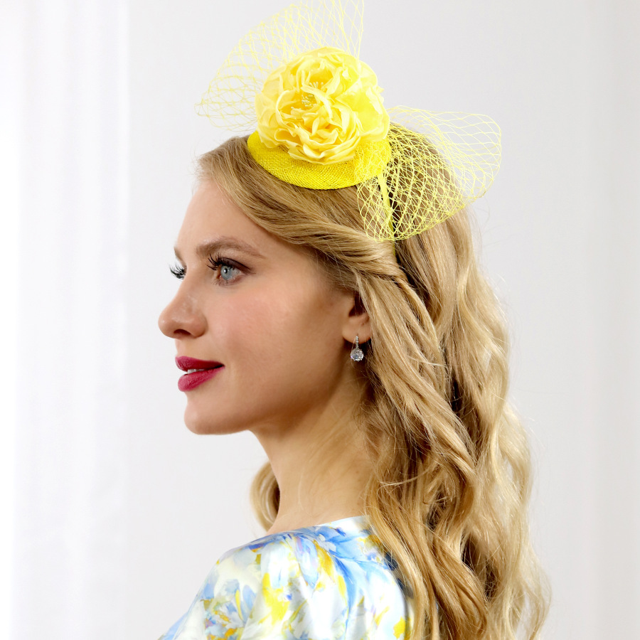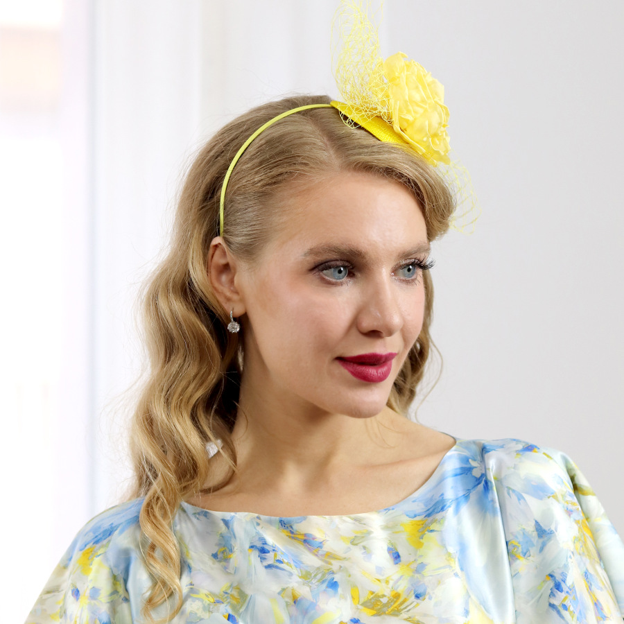Brigitte- žltý fascinátor s hodvábnou ružou
