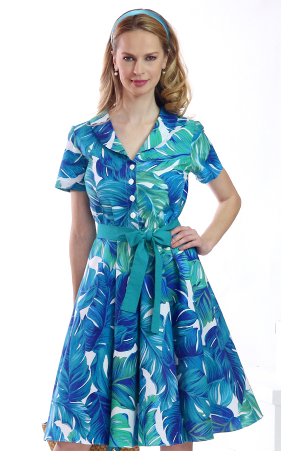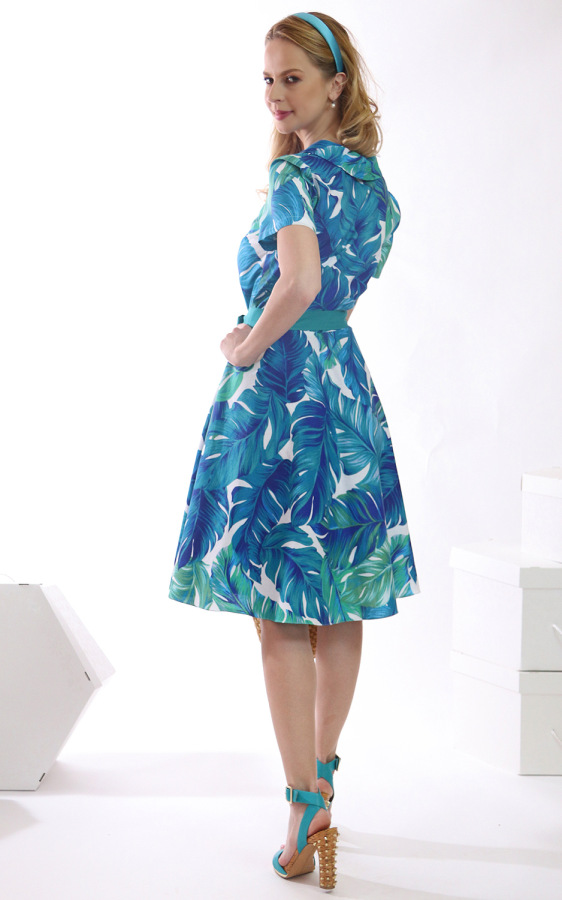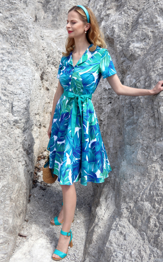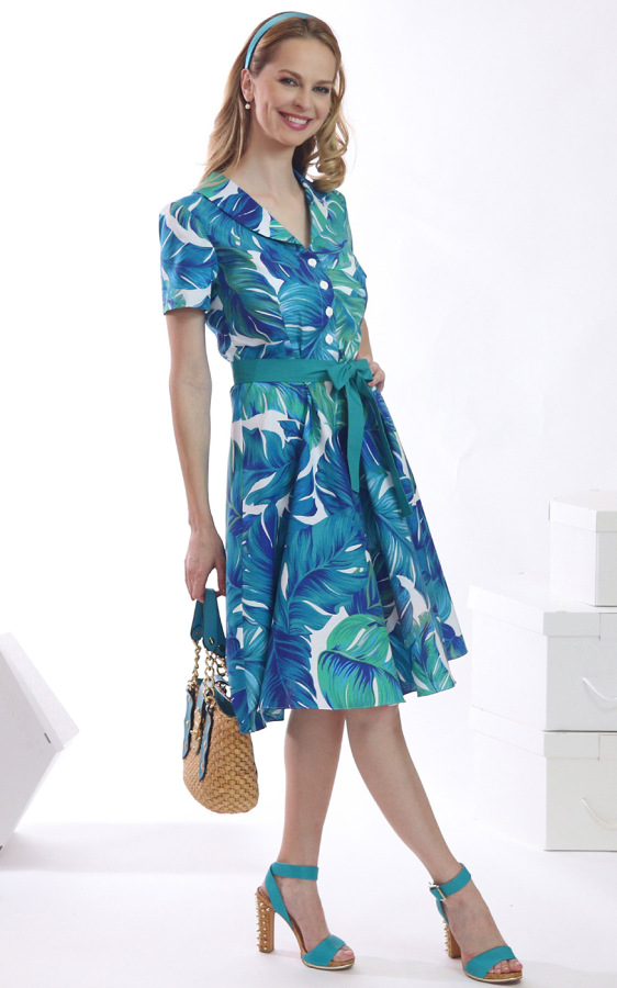 Elegantné šaty z bavlny s mierne kolovou sukňou ku kolenám. Majú véčkový výstrih so šálovým límčekom a krátky rukáv. Šaty sú bez podšívky so zapínaním na gombíky vpredu a na zips na ľavom boku. Môžete ich nosiť s opaskom, ktorý je priložený. K šatám sa dá zakúpiť aj tylová spodnička. Všetky použité materiály boli pred zhotovením predprané.
