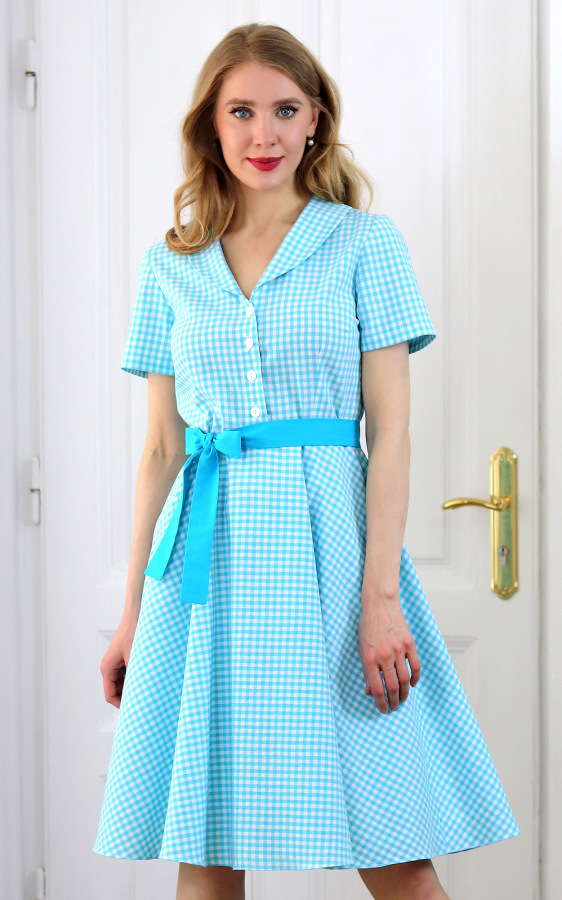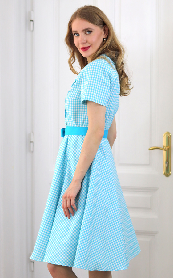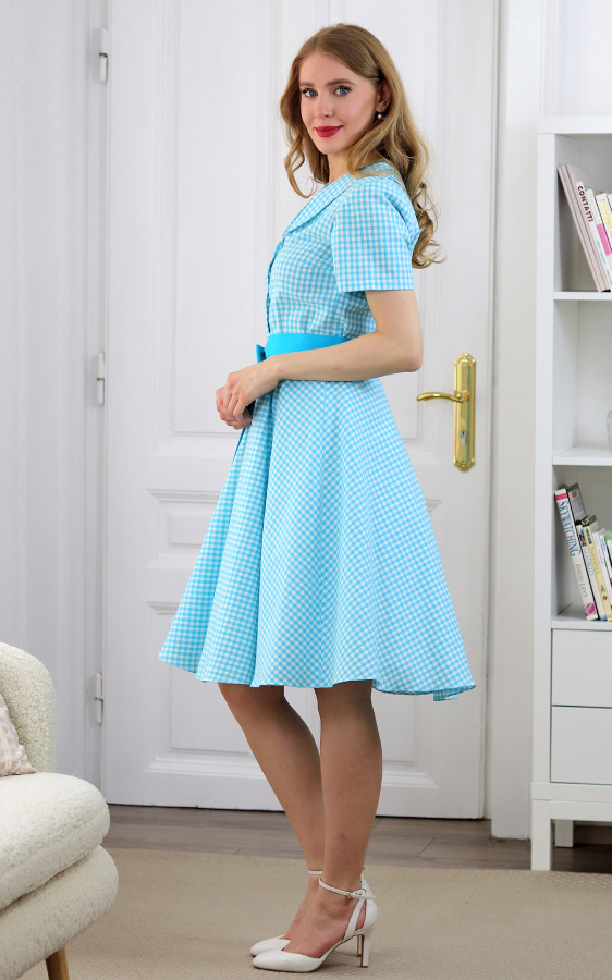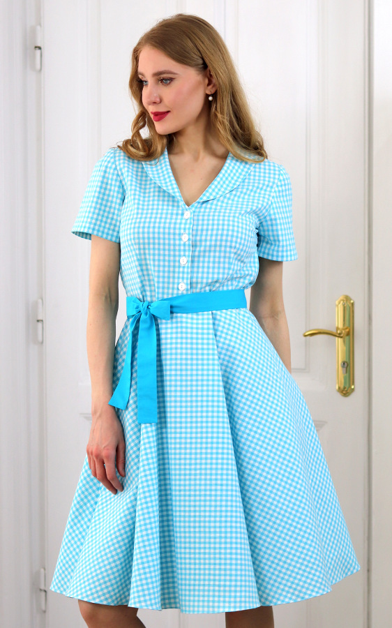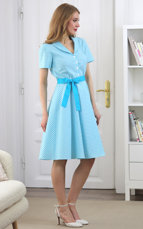 Výstrih v tvare V lemuje elegantný oválny límec v retro štýle. Zvýraznený pás a mierne padavá A-čková sukňa pridávajú siluete na ženskosti. Šaty majú krátke rukávy. Dopĺňa ich jednofarebný opasok z bavlneného popelínu. Predné zapínanie a skrytý zips na ľavom boku vám umožní ľahké obliekanie.