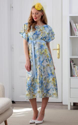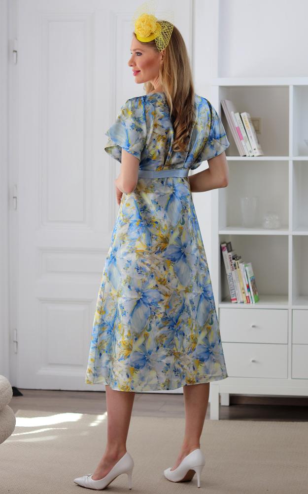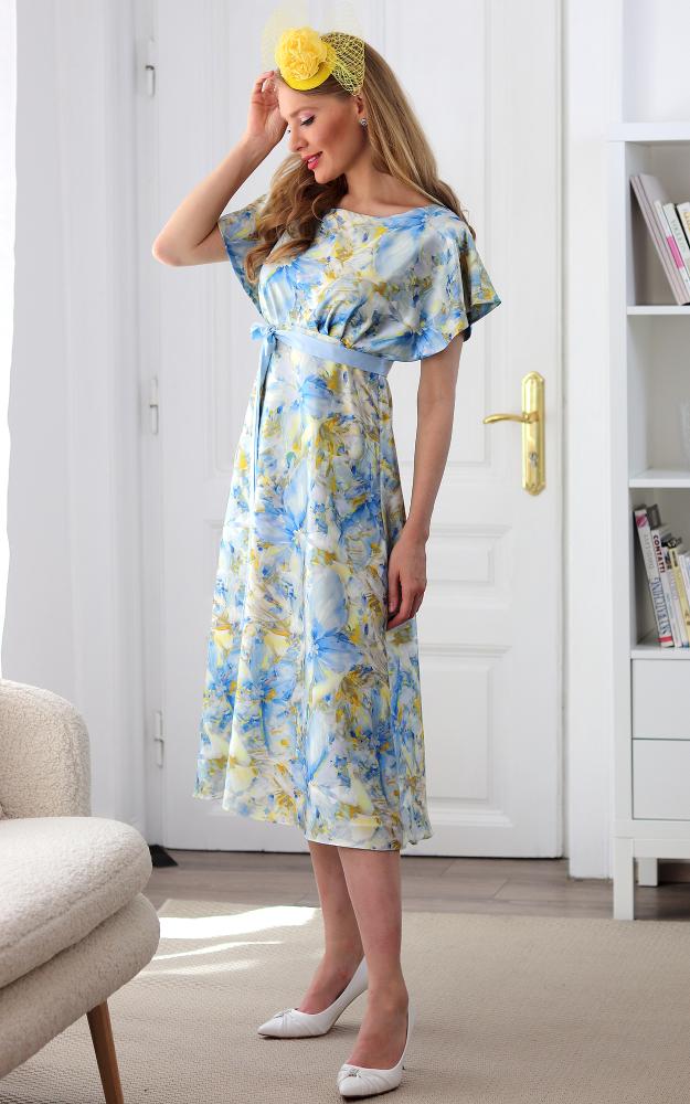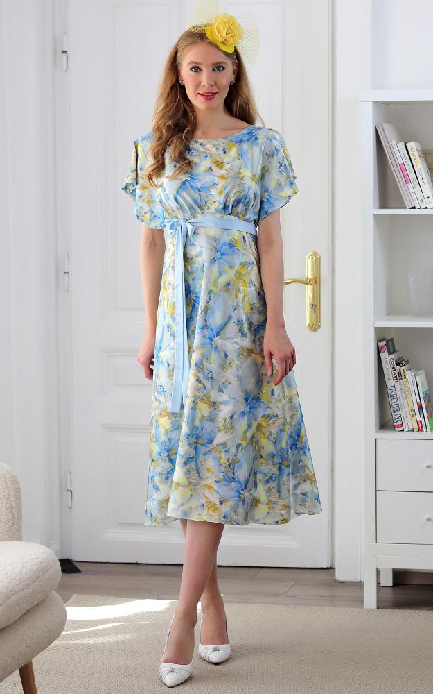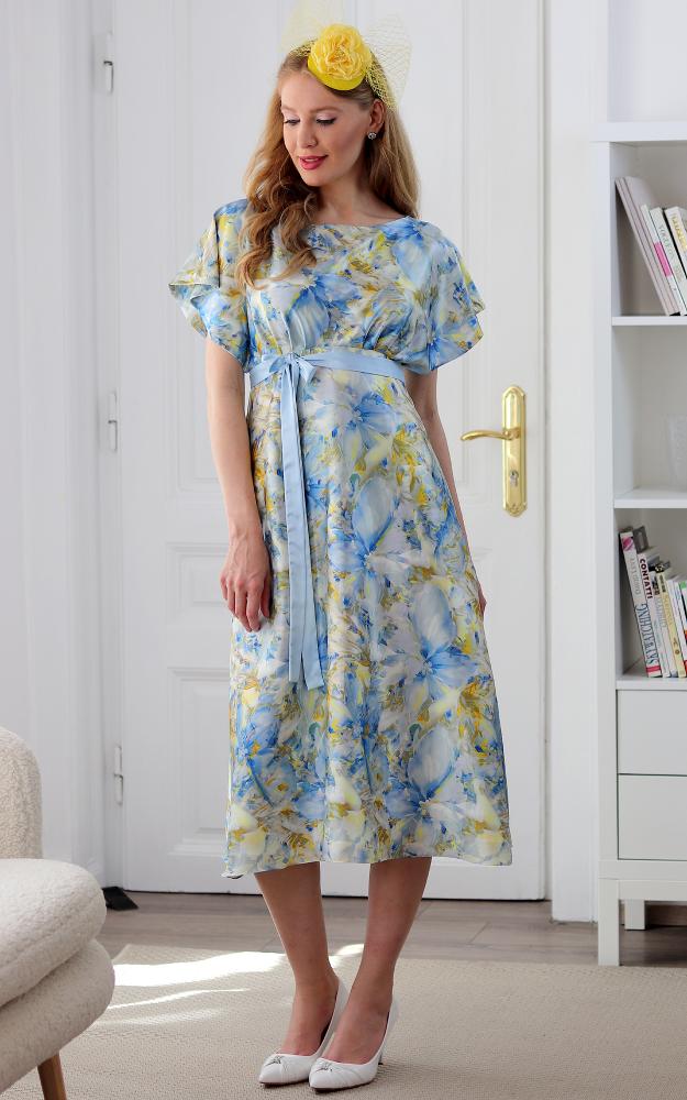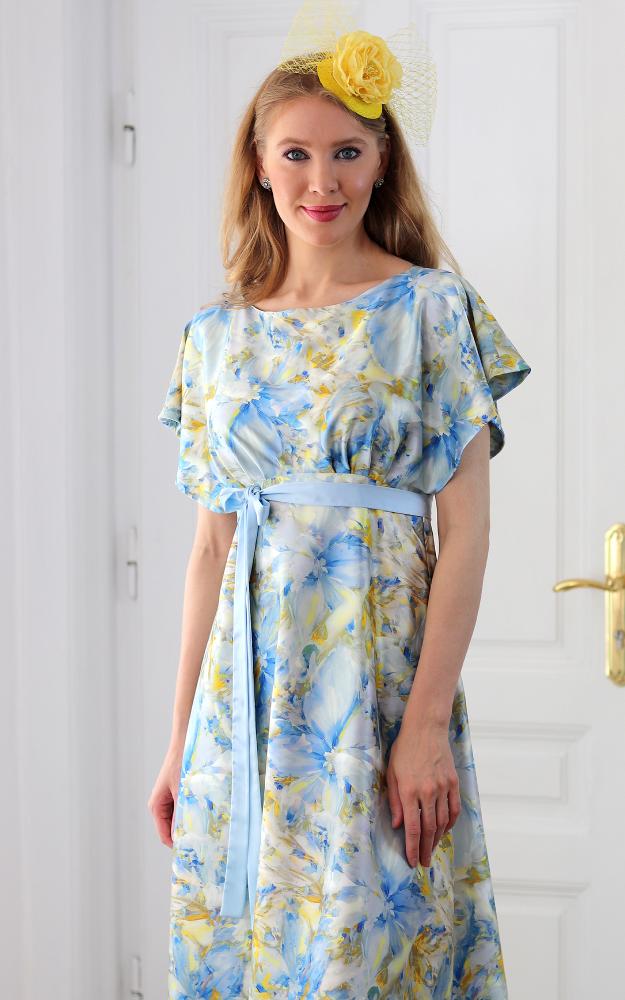 Elegantné midi šaty s A-čkovou sukňou z acetátového hodvábu. Majú lodičkový výstrih vpredu i vzadu a padavé rukávy. Šaty sú podšité. Majú zapínanie na zips na ľavom boku. K šatám je priložený opasok, ktorý pridáva na elegancii, keď sa uviaže.
