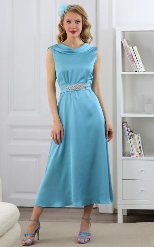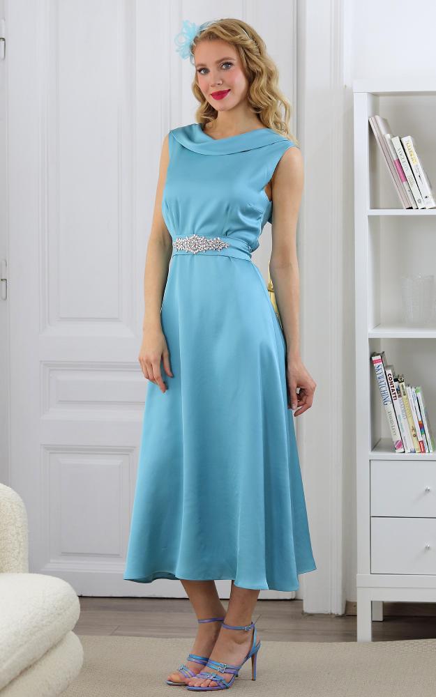 Elegantné midi šaty s A-čkovou sukňou z viskózového saténu. Majú retro límec, ktorý lemuje V-čkový výstrih na chrbte. Šaty sú podšité. Majú zapínanie na zips vzadu na chrbte. Dekorované sú opaskom s kryštálovou výšivkou.