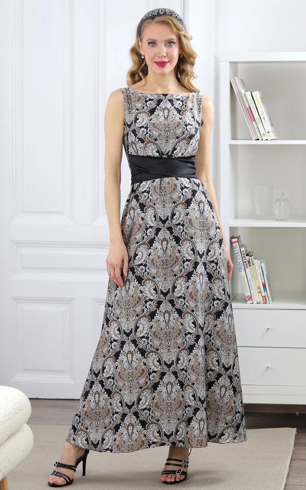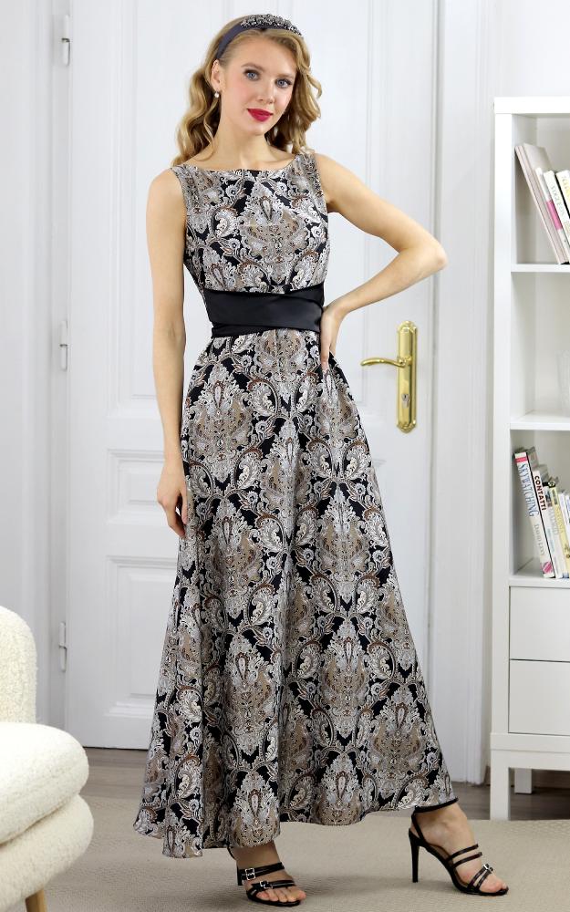 Elegantné dlhé šaty s A-čkovou sukňou z acetátového hodvábu. Majú lodičkový výstrih vpredu i vzadu. Šaty sú bez rukávov a sú podšité. Majú zapínanie na zips na ľavom boku. Opasok je všitý v bočných švíkoch, čo vytvára krásny efekt, keď sa uviaže.