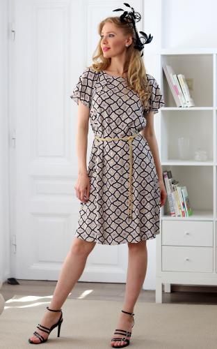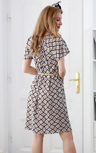 Elegantné šaty z viskózy s oválnym výstrihom a raglánovými rukávmi. K šatám je priložený tenký točený opasok. Šaty sa obliekajú prevlečením cez hlavu. Všetky použité materiály boli pred zhotovením predprané.