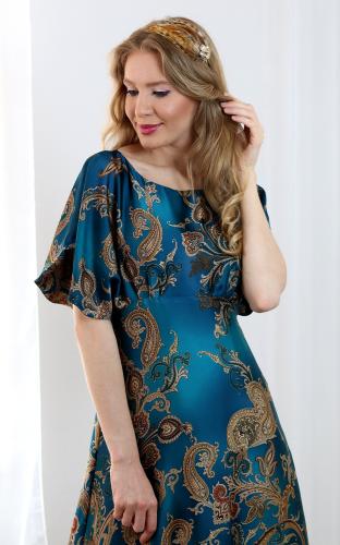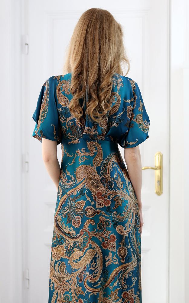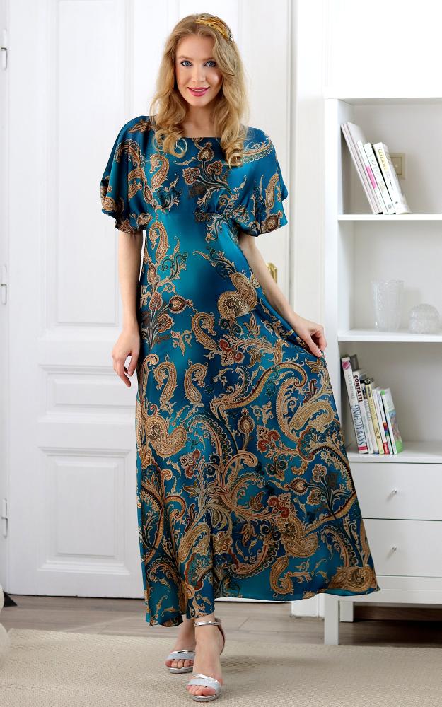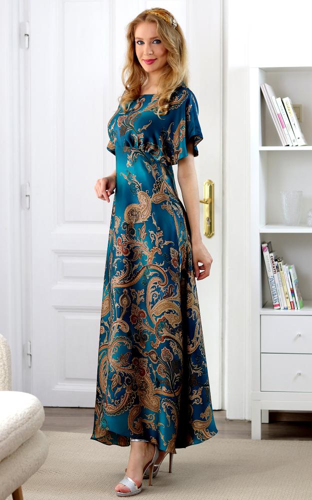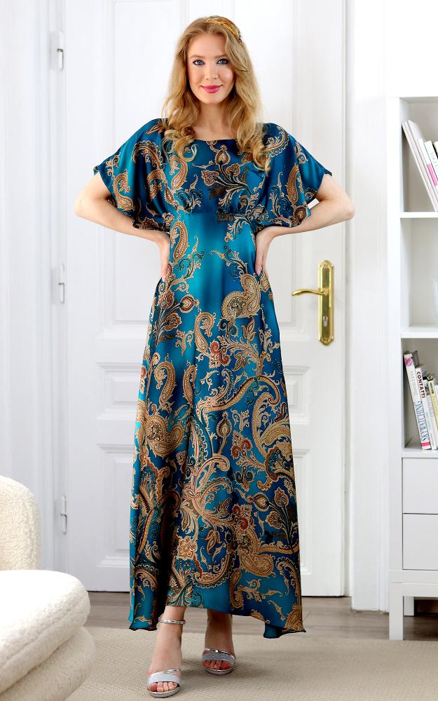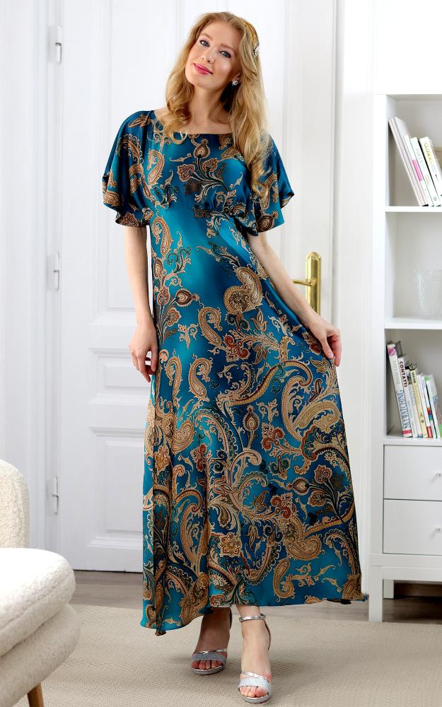 Elegantné dlhé šaty s A-čkovou sukňou z acetátového hodvábu. Majú lodičkový výstrih vpredu i vzadu a padavé rukávy. Šaty sú podšité. Majú zapínanie na zips na ľavom boku.