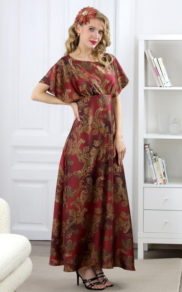 Elegantné dlhé šaty s A-čkovou sukňou z acetátového hodvábu. Majú lodičkový výstrih vpredu i vzadu a padavé rukávy. Šaty sú podšité. Majú zapínanie na zips na ľavom boku.