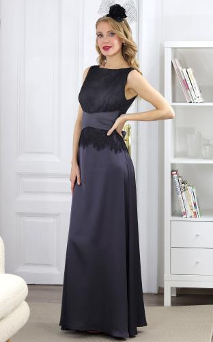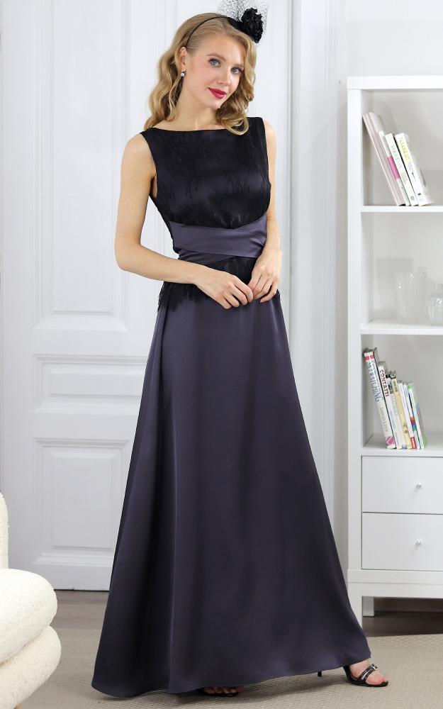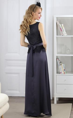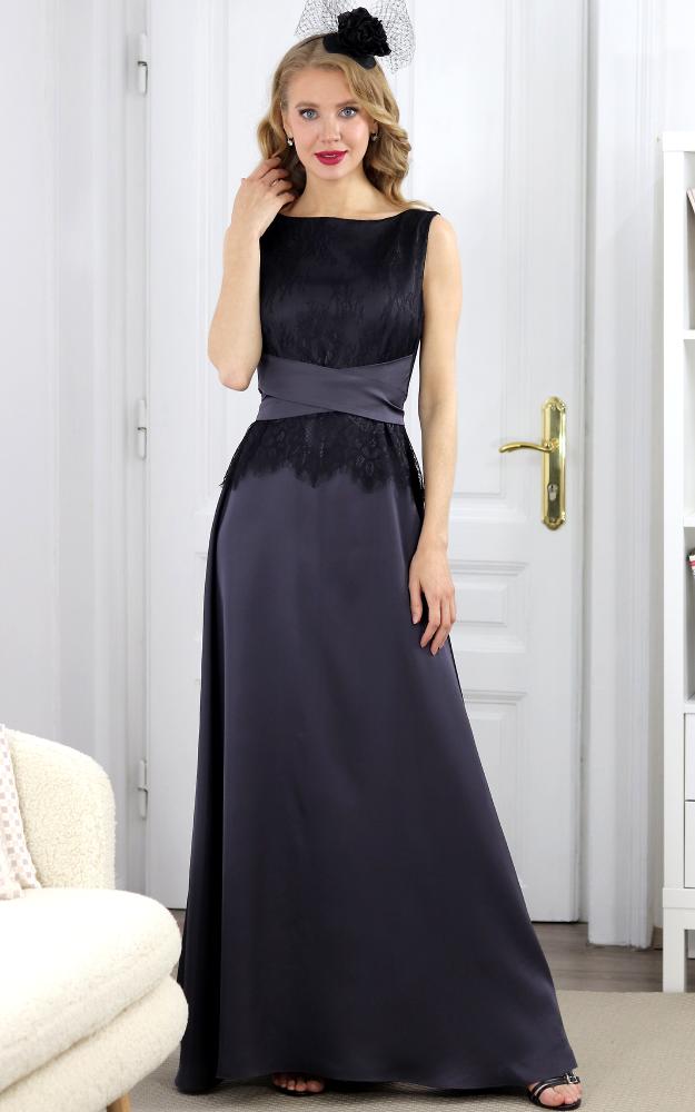 Elegantné dlhé šaty s A-čkovou sukňou. Majú lodičkový výstrih vpredu i vzadu. Vrch šiat je prekrytý Chantilly čipkou. Šaty sú podšité. Majú zapínanie na zips na ľavom boku. Opasok je všitý v bočných švíkoch, čo vytvára krásny efekt, keď sa uviaže.