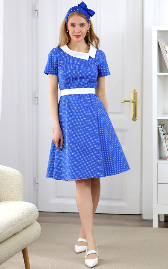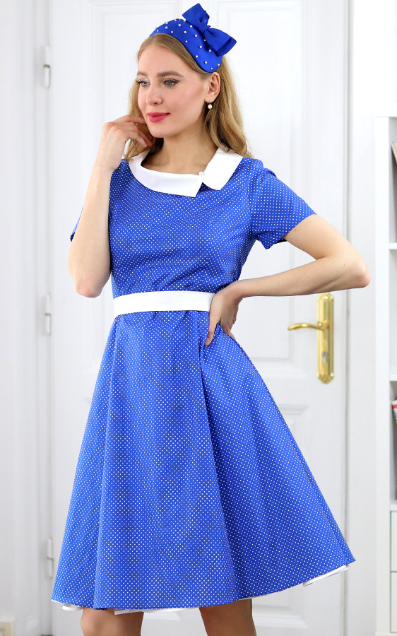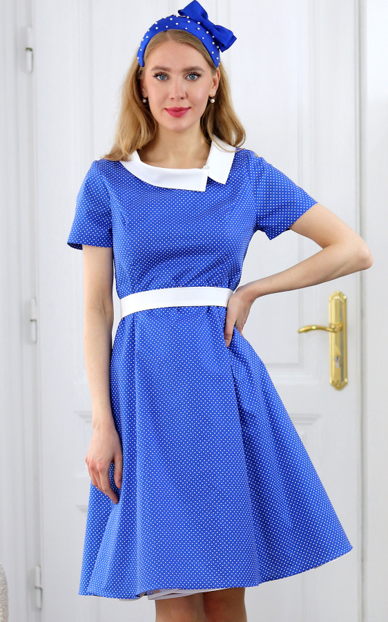 Eleanor - modré bavlnené princesové šaty s bielymi bodkami