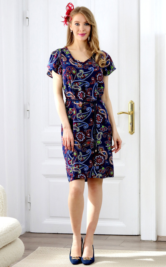 Padavé šaty z viskózy voľného A-čkového strihu s V výstrihom a elegantými krátkymi rukávmi. K šatám je priložený opasok. Všetky použité materiály boli pred zhotovením predprané.