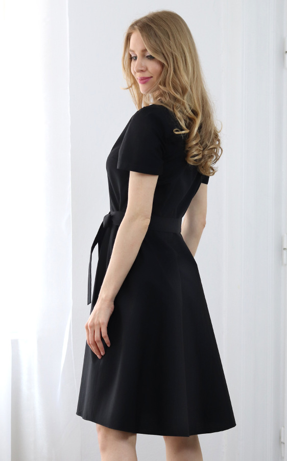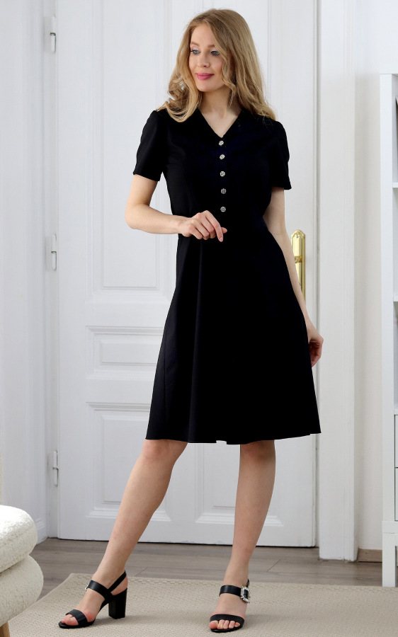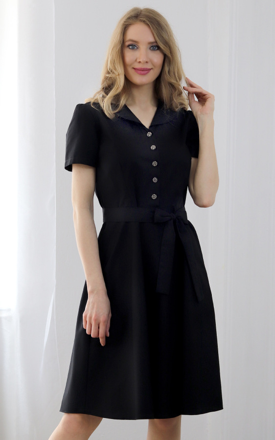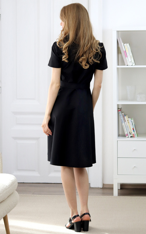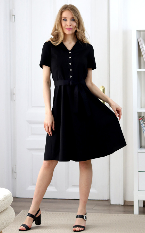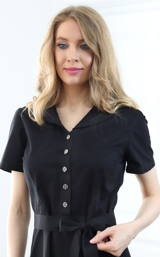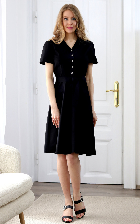 Elegantné šaty z bavlneného popelínu s mierne kolovou sukňou. Majú límček a 3/4 rukáv s manžetou. Šaty sú bez podšívky so zapínaním vpredu na strieborné gombičky s kryštálmi a na zips na ľavom boku. Môžete ich nosiť s opaskom. Všetky použité materiály boli pred zhotovením predprané.