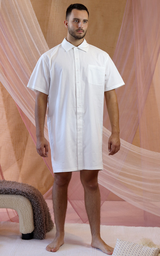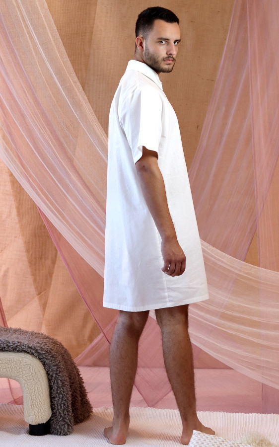 Nočná košeľa s 3/4 rukávom z bio bavlny, klasický límec, predné zapínanie na gombíky. Dĺžka košele je cca 103 cm.