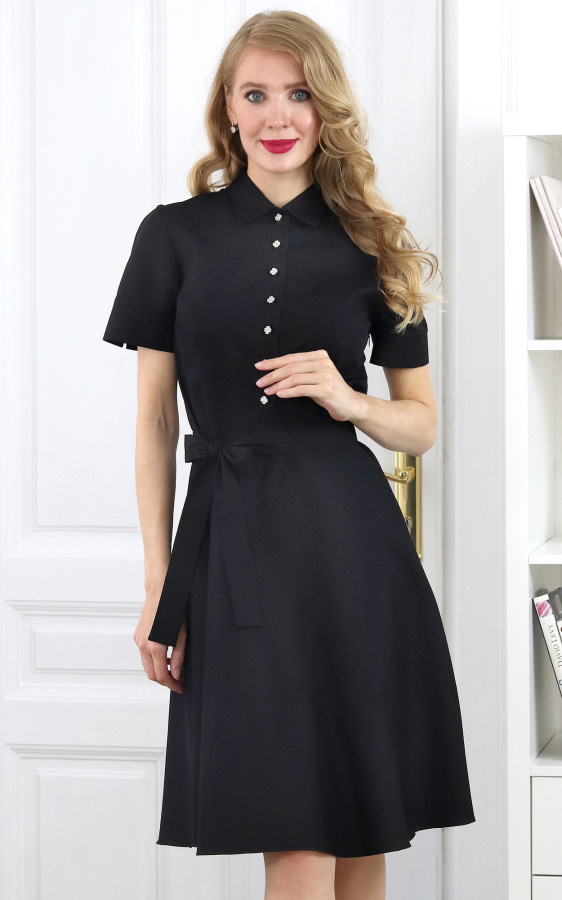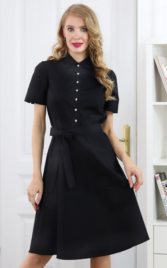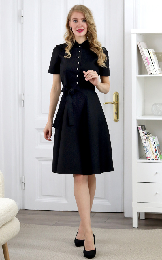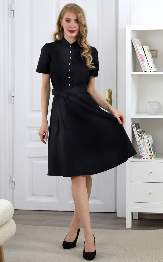 Elegantné šaty z bavlneného popelínu s A-čkovou sukňou. Šaty majú límček a krátke rukávy s manžetou. Sú bez podšívky. Zapínajú sa na gombíky vpredu a na zips na ľavom boku. Môžete ich nosiť s opaskom, ktorý je priložený. Všetky použité materiály boli pred zhotovením predprané.