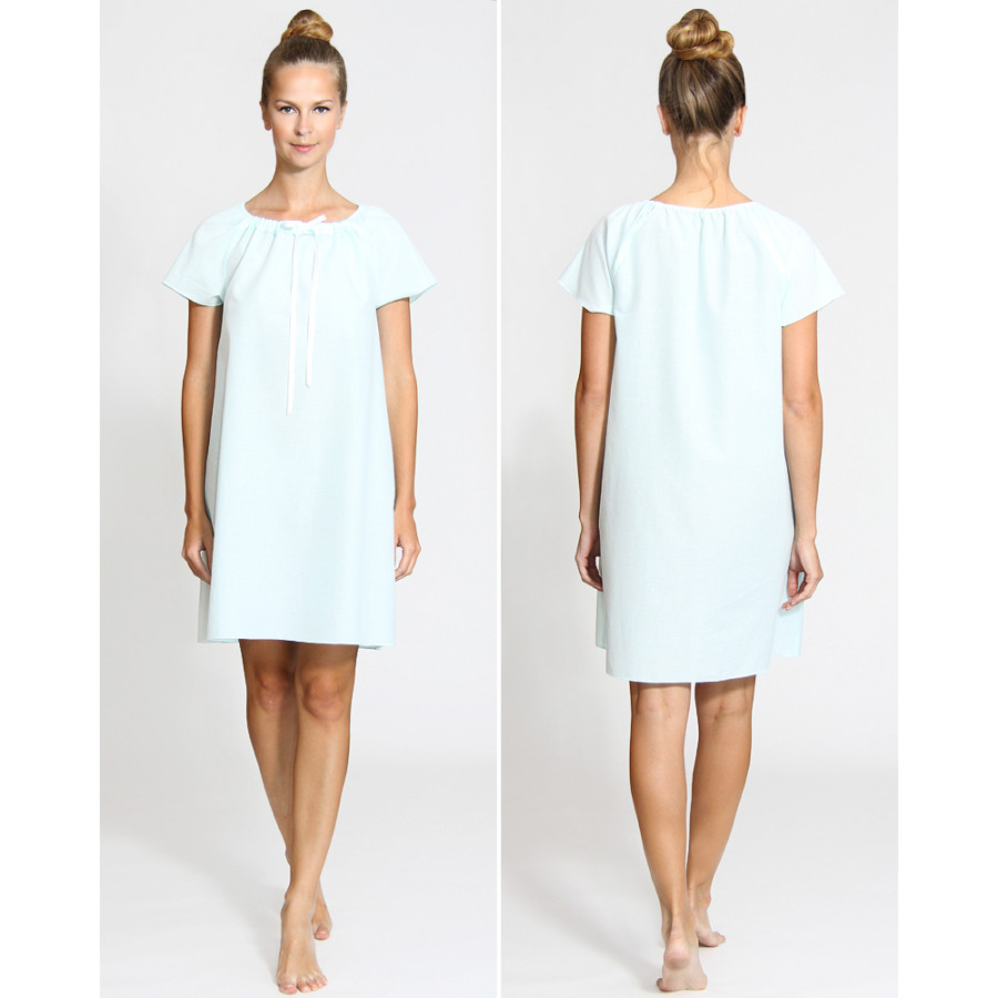 Nočná košeľa z bio bavlny voľného strihu s elegantnými rukávmi, zadný výstrih nazberaný na gumičku, predný výstrih na stiahnutie na stužku.