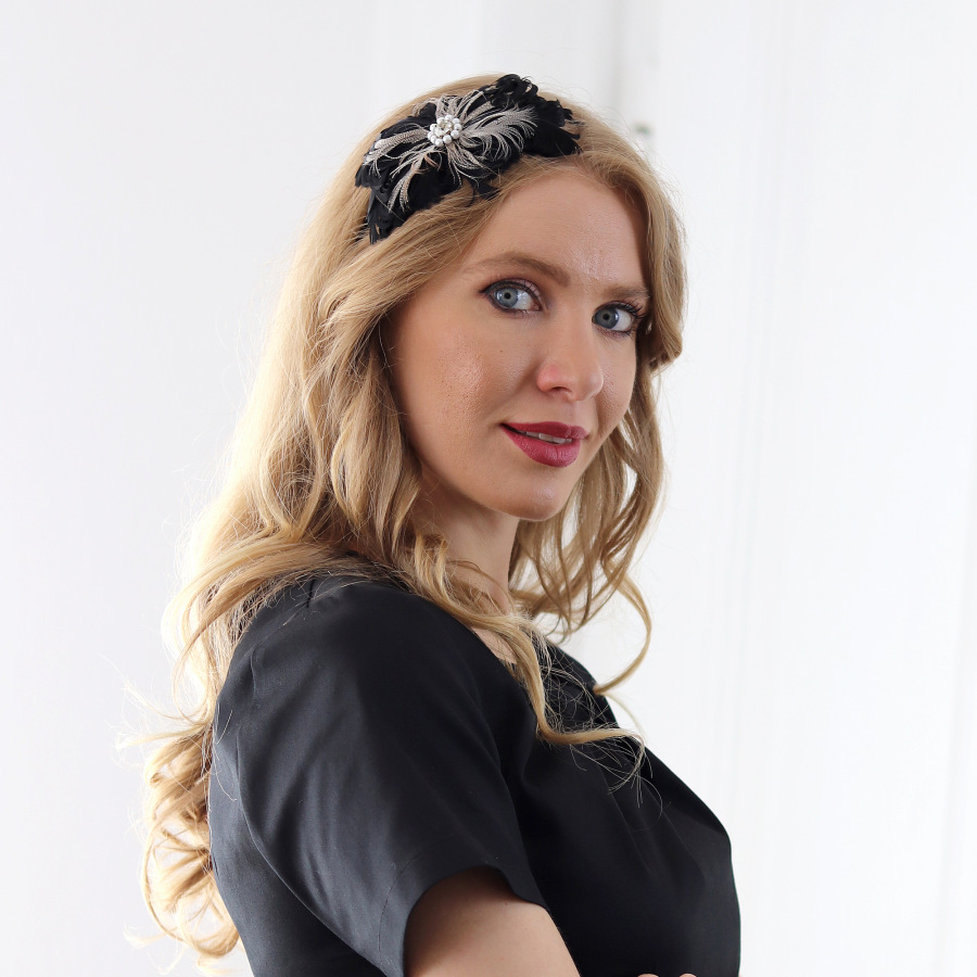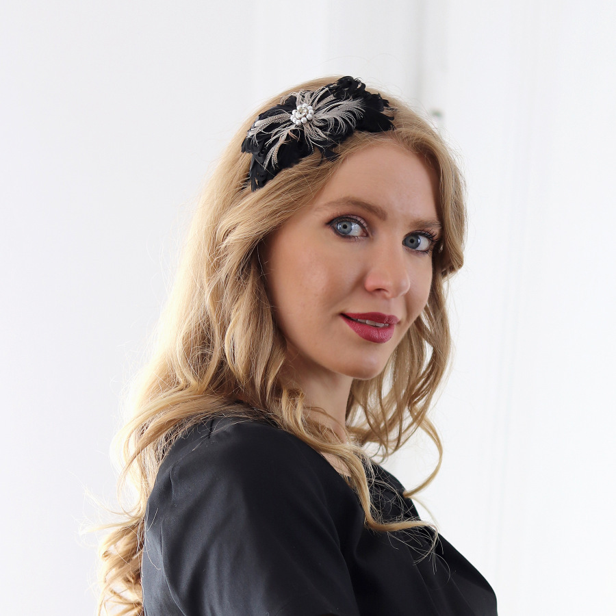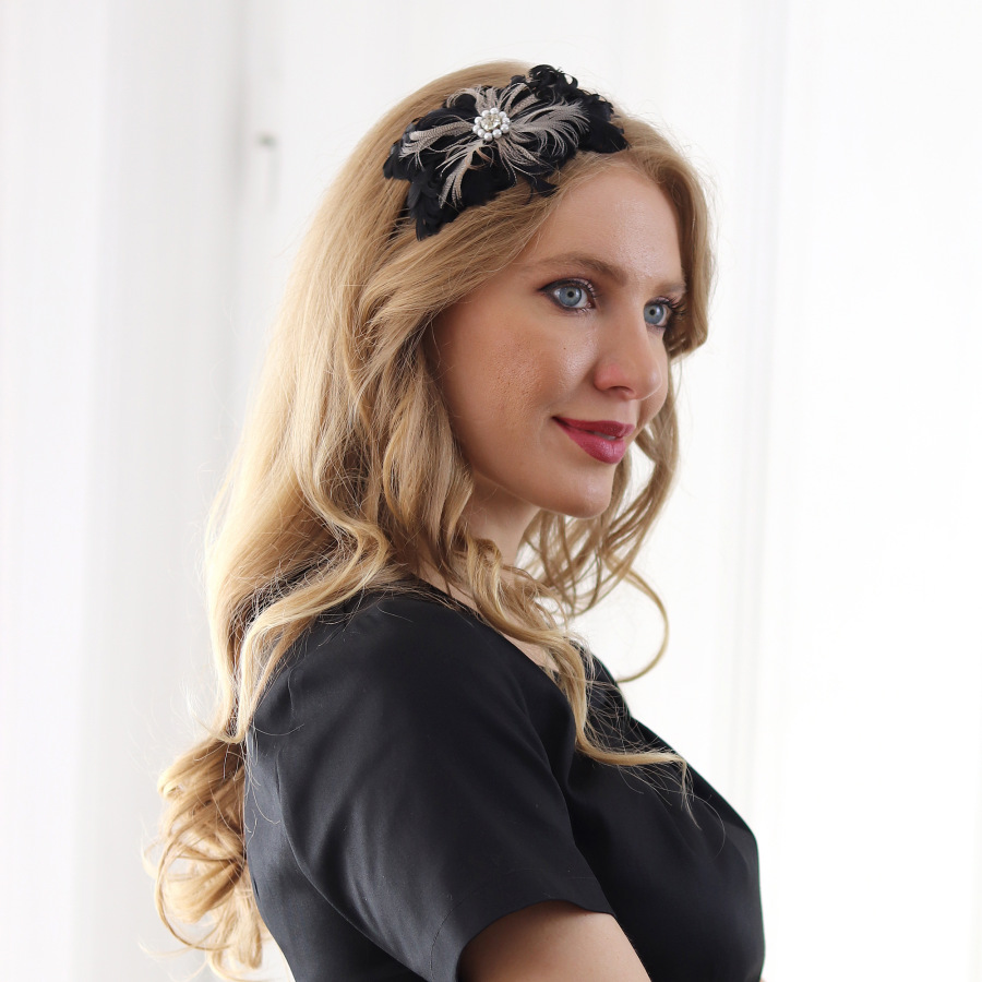 Čelenka z kučeravého husieho peria, ozdobená kryštálom a perlami.
