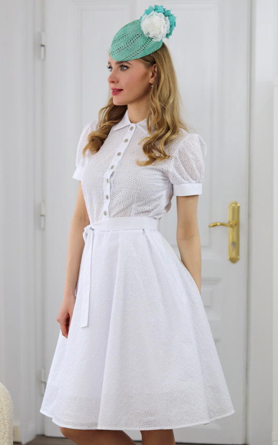 Košeľové šaty z bavlnenej madeiry s mierne kolovou sukňou. Majú límček a krátky rukáv. Sukňa je podšitá. Šaty sa zapínajú na gombíky vpredu a na zips na ľavom boku. Môžete ich nosiť s opaskom, ktorý je priložený. K šatám sa dá zakúpiť aj tylová spodnička. Všetky použité materiály boli pred zhotovením predprané.