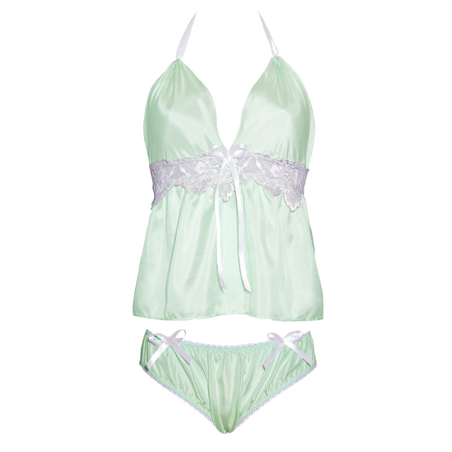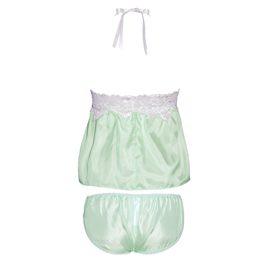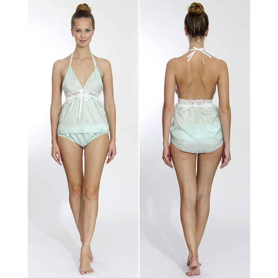 Set pozostáva z luxusnej krátkej košieľky a nohavičiek z hodvábu. Krátka košieľka je ozdobená elastickou čipkou a stužkou. Zaväzuje sa okolo krku. Nohavičky sú na páse a okolo nôh ukončené ozdobnou gumou a ozdobené mašličkami.