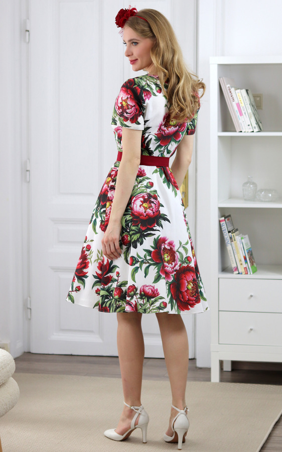 Peony - letné šaty s pivonkami na bielom podklade, autorská potlač