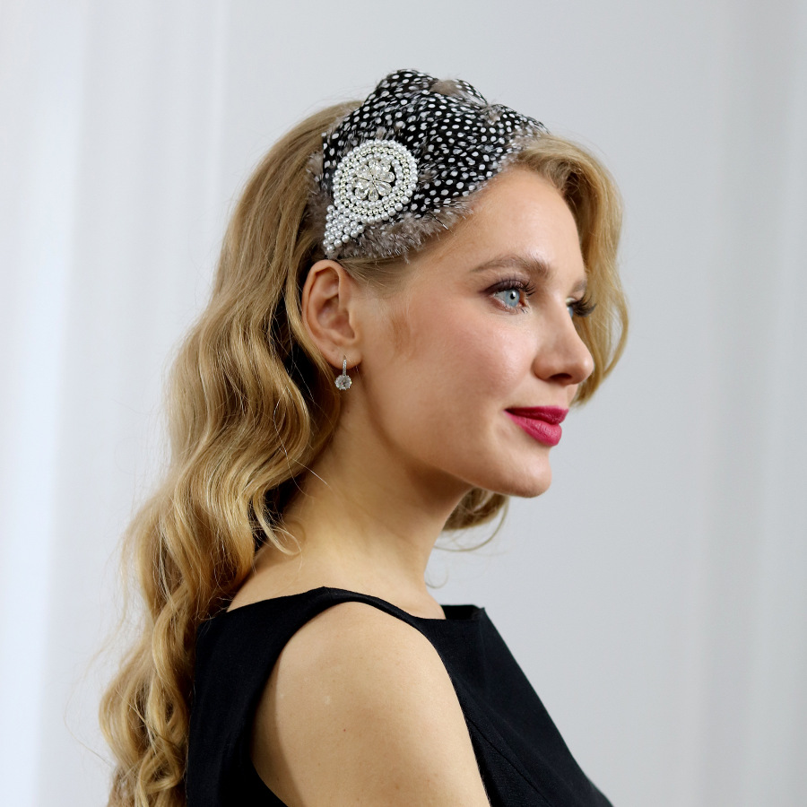 Luxusná čelenka vo vintage štýle z peria perličky na základe zo sinamayu. Je bohato ozdobená perlami a kryštálmi. Čelenka je obalená v hodvábe.