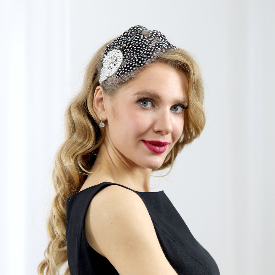 Materiály: 100% hodváb, perie, perly, Swarovski kryštály, sinamay (100% abaka).
