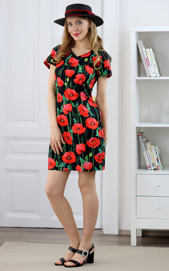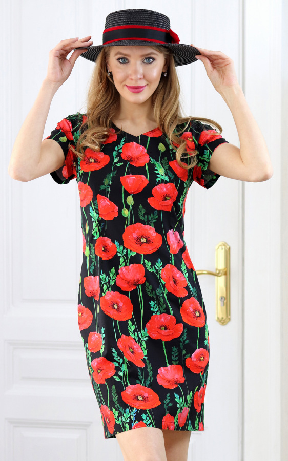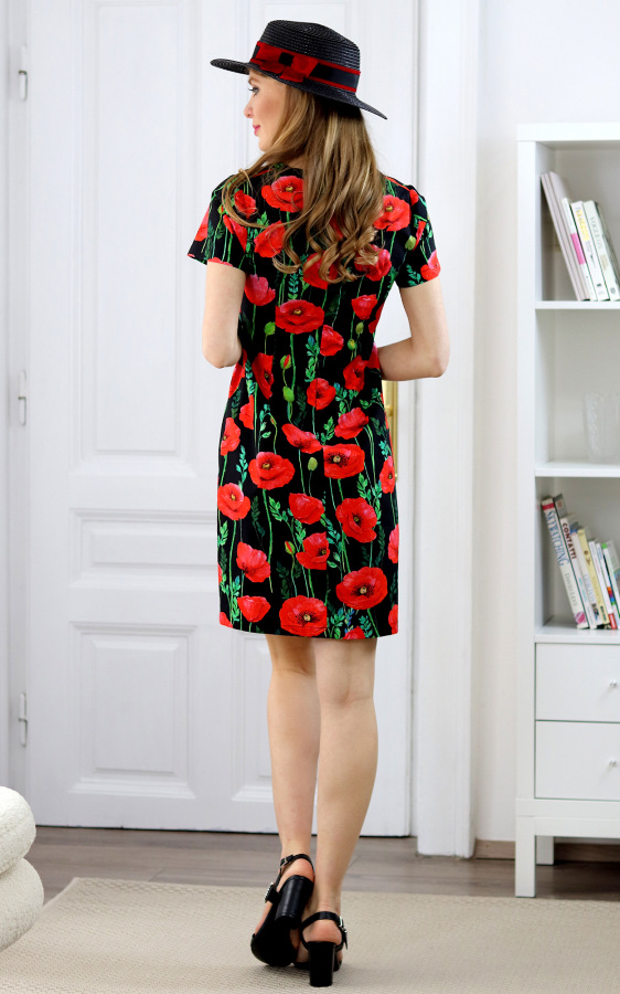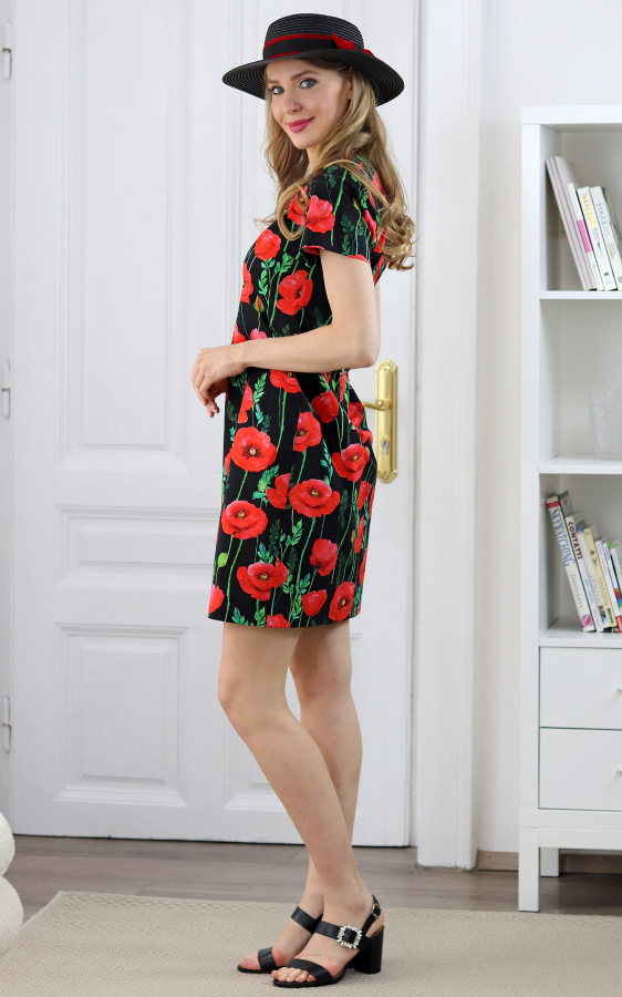 Puzdrové šaty z bavlneného popelínu s krátkymi rukávmi. Majú V výstrih. Zapínajú sa na zips vzadu. Všetky použité materiály boli pred zhotovením predprané.