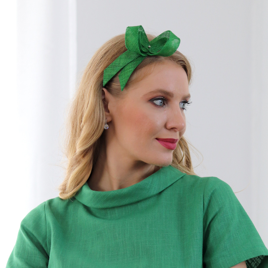 Fascinátor v tvare mašle z prírodnej slamy sinamay, ozdobený kryštálom. Upevnený je na čelenke. Môže vám ho vyrobiť tiež upevnený na hrebeni.
