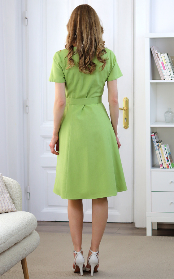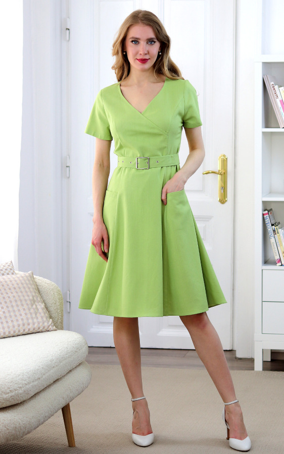 Charakteristický princesový strih dodáva šatám elegantný tvar a umožňuje precízne prispôsobenie strihu na hrudník, pás a boky. Opticky predlžuje siluetu a necháva tak vyniknúť krivkám ženskej postavy. Šaty majú zaujímavé a praktické detaily - prekrížený výstrih v tvare V, všité vrecká a opasok s kovovou sponou, ktorý môžete alebo nemusíte použiť. Pohodlné obliekanie vám umožní zapínanie na zips vzadu na chrbte. Materiál je dostatočne husto tkaný, preto šaty nepotrebujú podšívku.