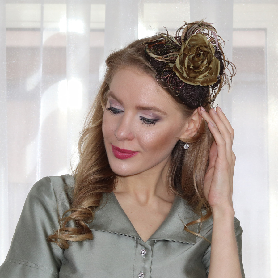 Klobúčik s hodvábnou ružou, husím a pávím perím na základe zo sinamayu, prírodnej slamy. Upevnený je na čelenke.