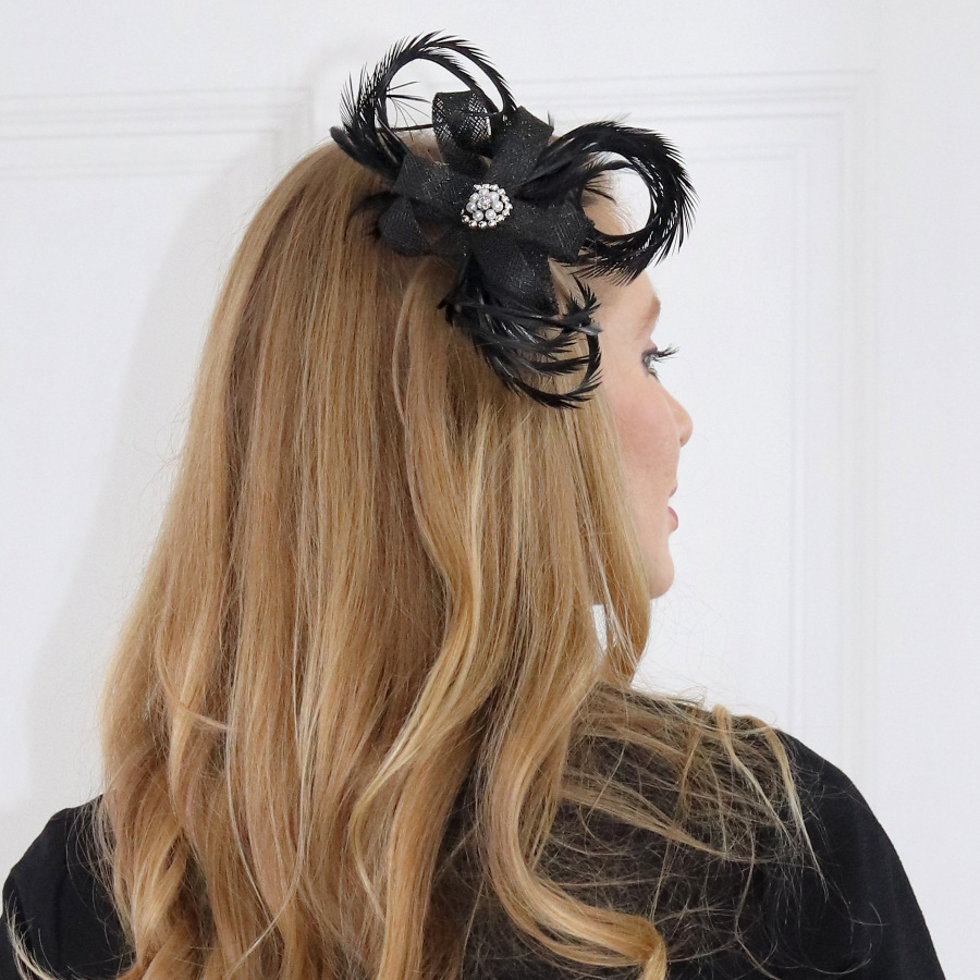 Trojlístok - čierny fascinátor na hrebeni s perím
