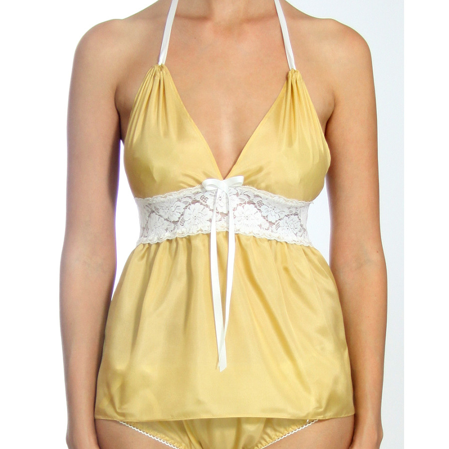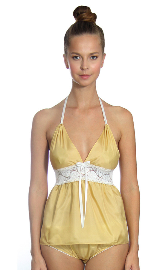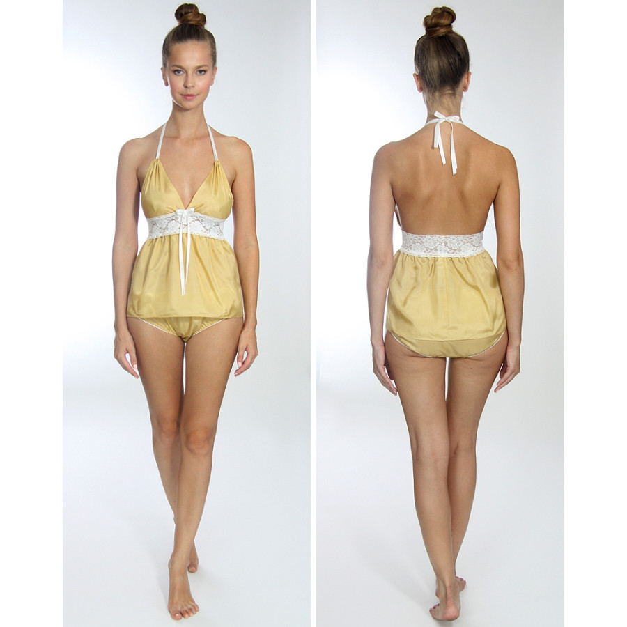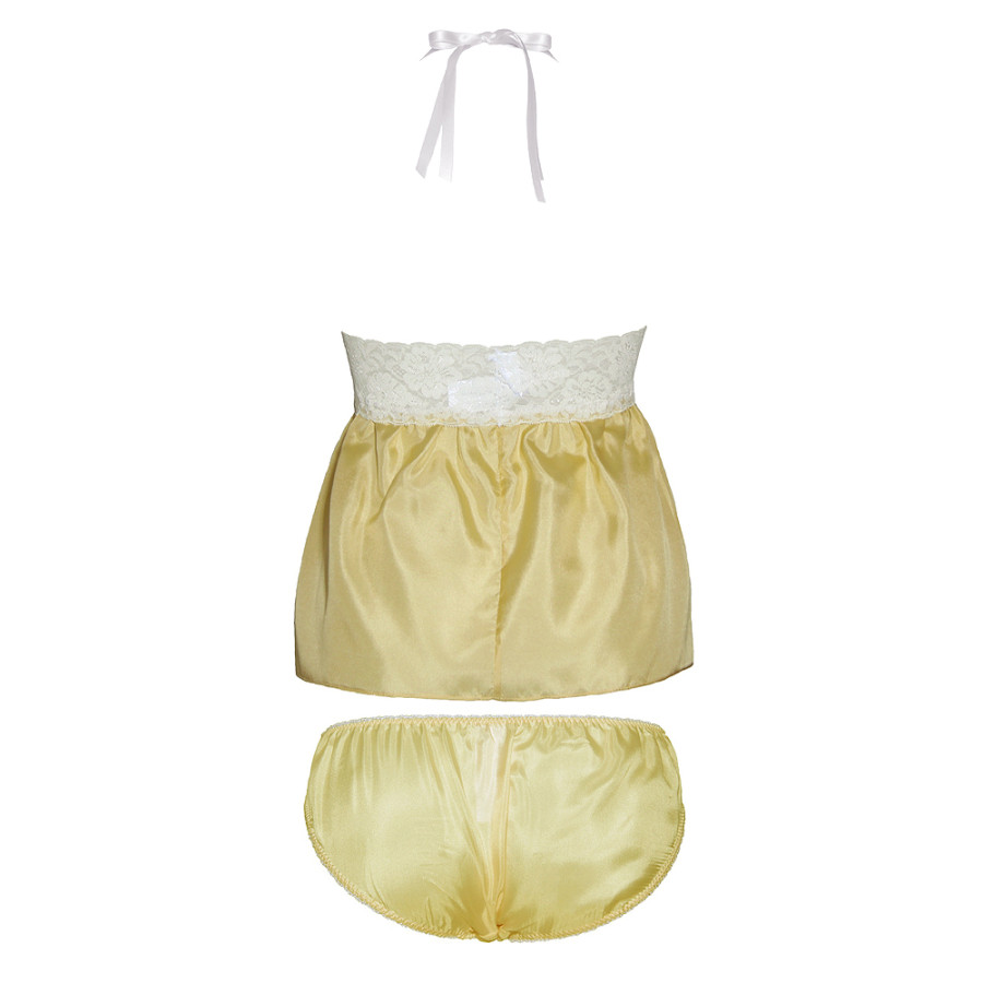 Set pozostáva z luxusnej krátkej košieľky a nohavičiek z hodvábu. Krátka košieľka je ozdobená elastickou čipkou a stužkou. Zaväzuje sa okolo krku. Nohavičky sú na páse a okolo nôh ukončené ozdobnou gumou a ozdobené mašličkami.